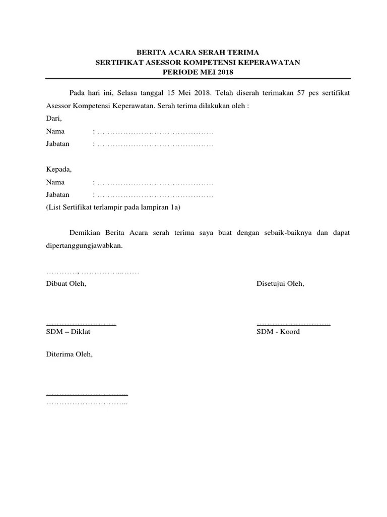 Dokumen serah terima barang/jasa sebagai bukti penyerahan dan peralihan hak/kepemilikan atas barang/jasa/surat berharga dari pemberi kepada penerima hibah 16. 11.03.2021 · surat tanda terima barang merupakan dokumen yang sangat penting yang harus diserahkan ketika terjadinya proses penyerahan barang. Distribusi dokumen apabila proses pembelian telah selesai dilakukan, maka staff purchasing mengumpulkan dokumen pembelian antara lain pr, po (bila ada), surat jalan supplier, berita acara serah terima kemudian diserahkan ke departemen akunting sebagai proses pembayaran 4.3. Surat perjanjian ini dibuat dengan pengertian tidak diharapkan timbulnya perselisihan, namun apabila terjadi perselisihan pendapat tentang pelaksanaan surat perjanjian ini langkah pertama adalah berupaya melakukan penyelesaian secara musyawarah oleh pihak pertama dan pihak kedua, dan hasil yang 5 dicapai dari musyawarah tersebut secara hukum bersifat mengikat …